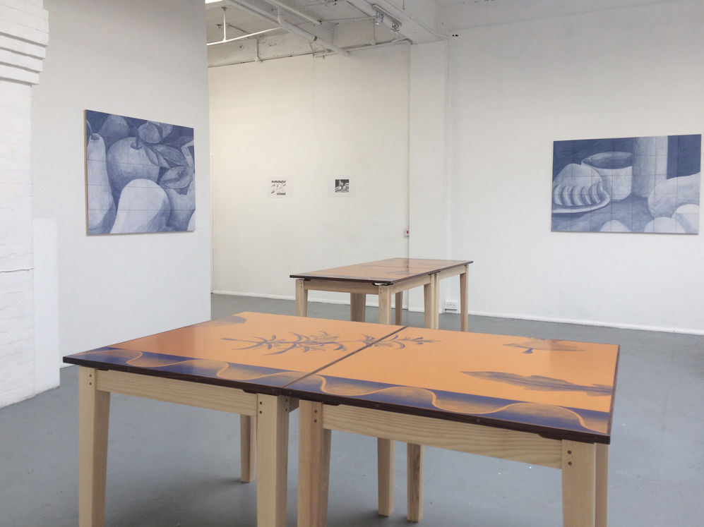 Transforming the gallery space into a communal dining hall, the installation forges parallels between traditional dining establishments and the public gallery as third places within today’s society. The works draw reference to the second century BC mosaics of Roman dining halls, known as the asàrotos òikos or ‘the unswept floor’.